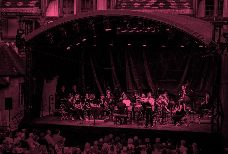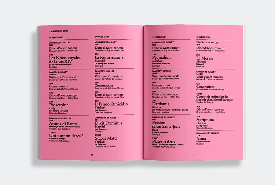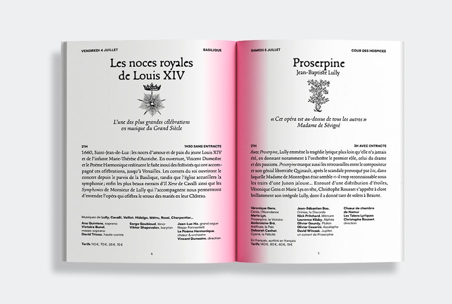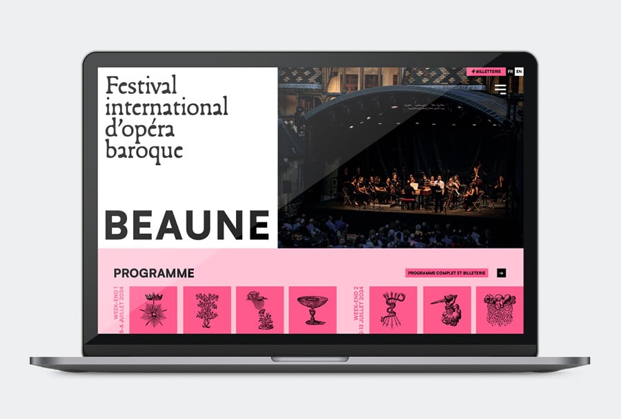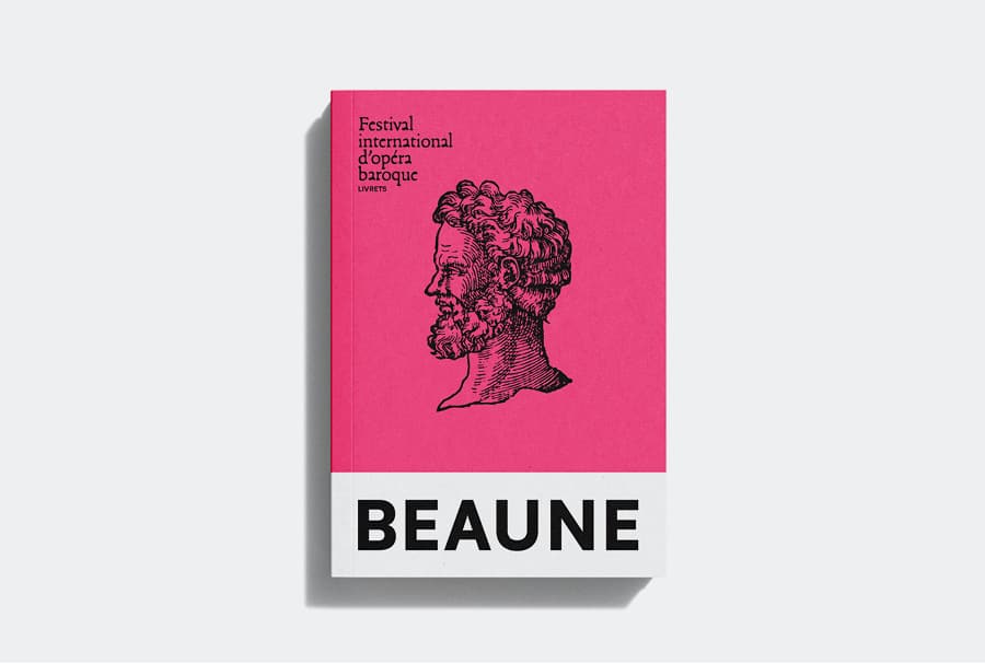 Nous sommes fiers d’être, non pas Bourguignons (personne n’est parfait), mais à l’origine de la nouvelle identité graphique du Festival de Beaune. Cette manifestation estivale met à l’honneur la musique baroque dans plusieurs lieux patrimoniaux de la ville. Pour traduire visuellement cet événement et les œuvres qu’il célèbre, nous avons puisé du côté de la typographie et de l’édition anciennes. La police de caractère employée est une création récente de Franck Jalleau, grand nom de la typographie française, décédé en avril 2025. Inspirée des caractères d’imprimerie du début du XVIe siècle, sa typographie reflète le côté artisanal de la création de lettres, à l’image des poinçonneurs qui gravaient chaque caractère dans l’acier. En écho, les illustrations employées sont issues d’un livre du XVIe siècle orné des gravures raffinées de Bernard Salomon. Le noir et blanc, marqueur important de cette nouvelle identité, est relevé d’une couleur pantone, qui enveloppe le tout d’une couche de radicalité. Merci à Maximilien Hondermarck, délégué général du Festival et passionné patenté, dont la confiance et l’enthousiasme nous ont permis de façonner une nouvelle image du Festival et de la musique baroque, hors des chemins déjà empruntés.