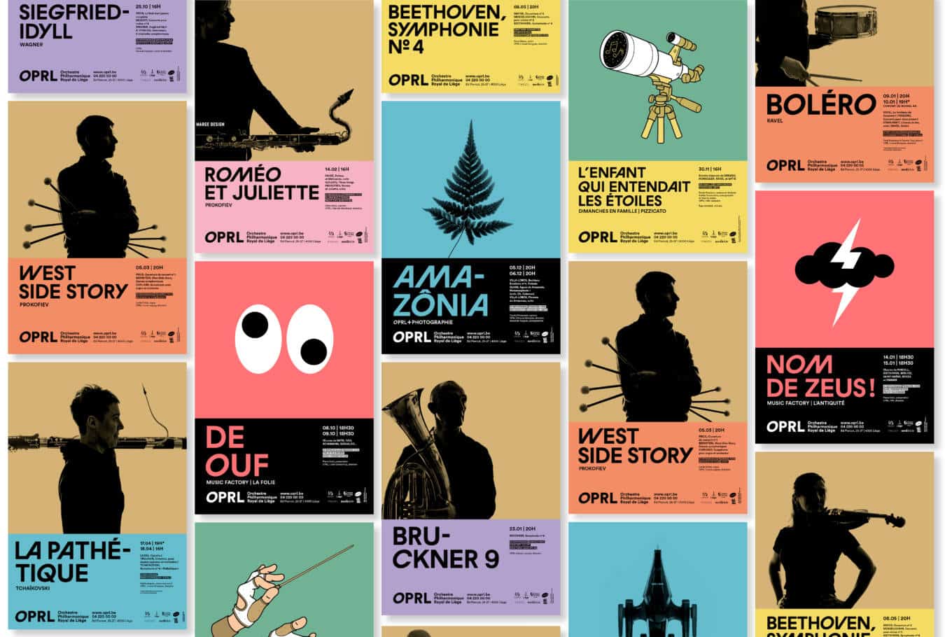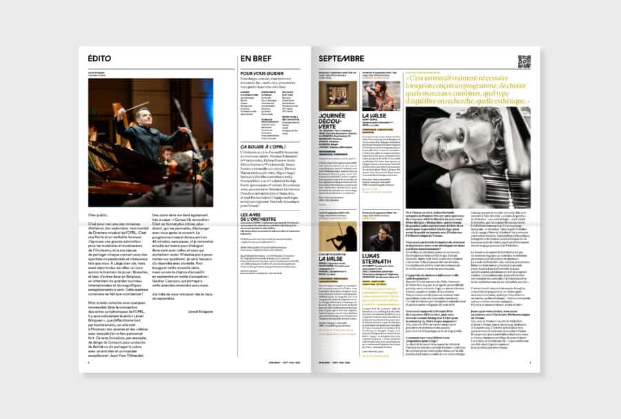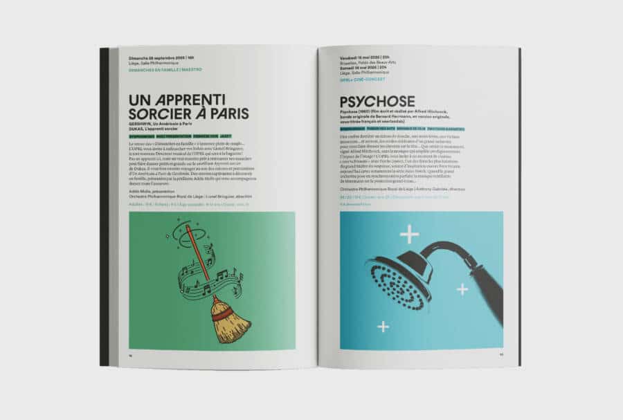 Généralement, tout changement de direction à la tête d’une grande institution culturelle sonne le glas des équipes en charge de son image. Mais comme les Belges ne font rien comme les autres, à commencer par les frites, septante fois meilleures que n’importe où ailleurs, ils n’ont rien trouvé de mieux que de nous garder. Aline Sam-Giao, désormais à la tête de ce magnifique paquebot musical qu’est l’Orchestre philharmonique royal de Liège, n’a cependant pas poussé l’improbable jusqu’à reprendre telle quelle la formule. Marquer une évolution était nécessaire, a minima pour annoncer l’arrivée du nouveau directeur musical. Tout ce que nous nous étions bien gardés d’ajouter ces dernières années, tenant la barre visuelle contre vents et marées, nous l’avons enfin fait : créer un caractère typographique dans la continuité du sigle de l’orchestre, optimiser et structurer les informations une fois pour toute, ouvrir de nouveaux registres photographiques plus axés sur les musiciens tout en conservant les illustrations de Timothy Durand pour les concerts en famille. En bref, garder le meilleur, simplifier ce qui peut l’être et ouvrir un nouveau chapitre. Honneur à l’époque Weissmann, longue vie à l’ère Sam-Gio.