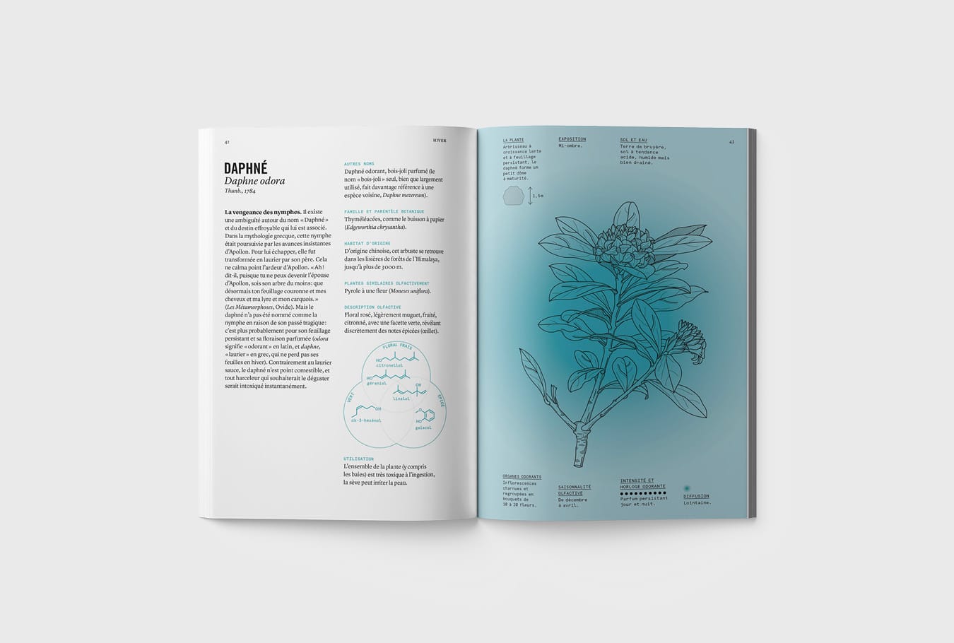 Appréhender les plantes avec son nez plutôt qu’avec ses yeux. Ça paraît aller de soi quand on sait que la majorité des végétaux produisent une odeur. Et pourtant cette approche, qui est celle de l’ouvrage Botanique olfactive de Giulio Giorgi paru aux éditions Nez début 2025, est inédite. Fruit d’un travail entre scientifiques et parfumeurs, l’ouvrage décrit par le menu tout ce qu’on peut savoir sur les composés odorants de plus de 52 espèces botaniques : leurs principales facettes parfumées, les molécules odorantes associées, leur saisonnalité olfactive, l’intensité et l’étendue de leur odeur… Pour ce faire, Marge Design s’est décarcassé pour dessiner des planches botaniques – magnifiques, cela va de soi – et y inclure de manière claire et sensible lesdites informations olfactives. Et c’est peu dire que dessiner les odeurs, c’est une autre paire de manches que de dessiner des moutons. Le tout est accompagné des photos singulières d’Audoin Desforges, qui a transposé son approche du portrait humain à celui des plantes. Une telle maîtrise du fond et de la forme a fait mouche : après quelques mois en librairie, le livre est déjà réimprimé. Avis aux curieux !