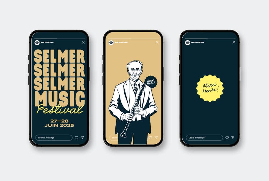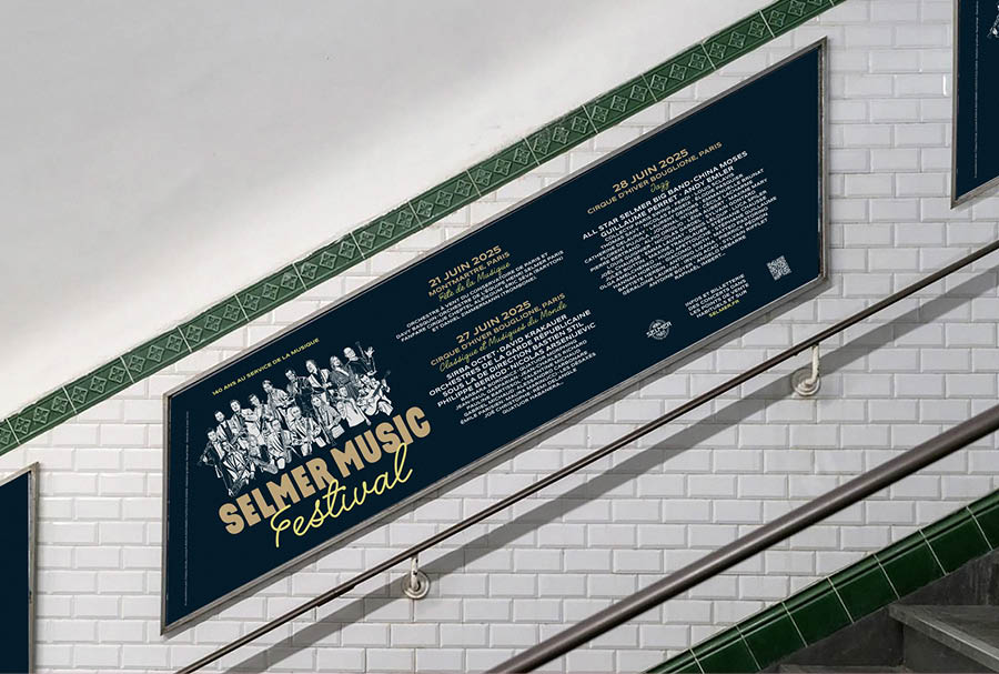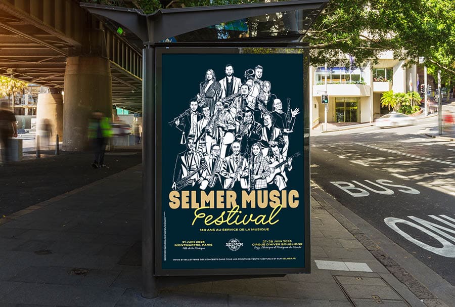Au printemps dernier, Selmer fêtait ses 140 ans. Pour les personnes qui n’ont pas acheté de clarinette ces 140 dernières années, Selmer c’est LA référence universelle en matière d’instruments à vent. La trompette d’Amstrong ? Selmer. Le sax de Coltrane ? Selmer. La clarinette de Portal ? Selmer. A priori, vous avez compris. Cet anniversaire a donné lieu à un véritable festival, en trois dates parisiennes, dont deux au Cirque d’Hiver, qui ont réuni plus de 140 artistes du monde entier. Pour accompagner la marque dans sa communication, la partition de Marge Design compte comme principales mesures le positionnement du nom du festival, la création d’une identité visuelle spécifique et la stratégie de déploiement qui va avec. Afin de célébrer cette réunion de musiciens hors-norme, nous optons pour un grand portrait de famille signé Erwann Terrier, où se côtoient les légendes du jazz et du classique, d’hier et d’aujourd’hui, toutes accompagnées de leur instrument. Et plutôt qu’un simple programme jetable, on échafaude un objet trois-en-un : à la fois programme des concerts et recension de l’histoire de la marque et des artistes (avec chronologie et biographies illustrées), l’objet totalement déplié devient l’affiche du festival au format géant. Le contraire d’une impro !