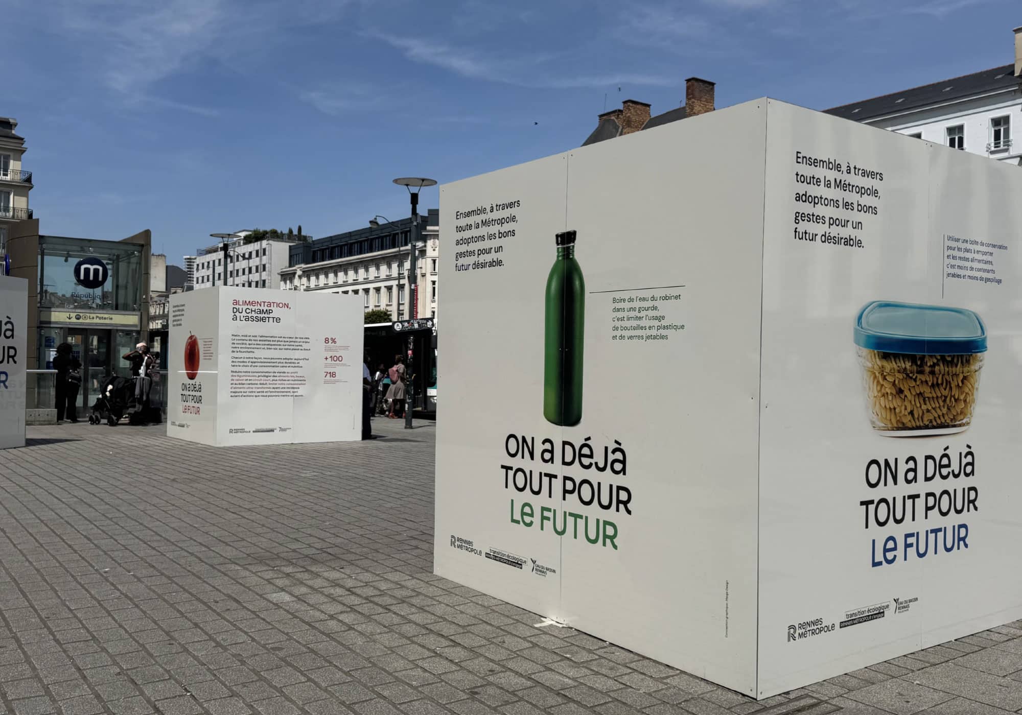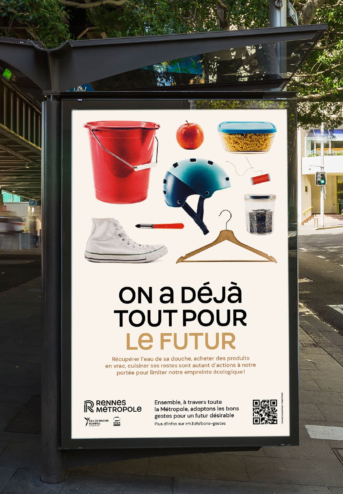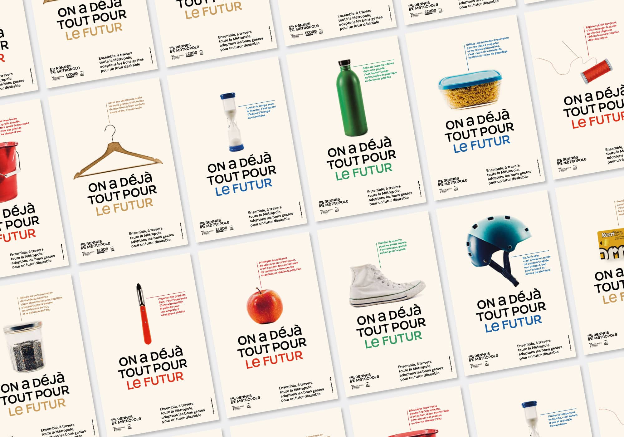 La métropole de Rennes, avec qui Marge Design a le plaisir de collaborer depuis des années, ne le sait que trop. Alors pour inciter ses habitants à aller dans le bon sens et si possible tous ensemble, elle a décidé de lancer une campagne de communication d’envergure incitant à changer nos comportements. Une campagne multimodale – avec une dizaine d’affiches, deux spots ciné, une expo dans l’espace public, etc. – que Marge Design a éco-conçue de A à Z, mais aussi éco-produite et éco-livrée en un temps record. Les ingrédients : un message fort, des « ambassadeurs » de campagne aussi populaires qu’un économe, un basket ou un sablier, une identité épurée pour un résultat percutant, à découvrir en ce moment. Merci à Rennes Métropole pour sa confiance renouvelée.