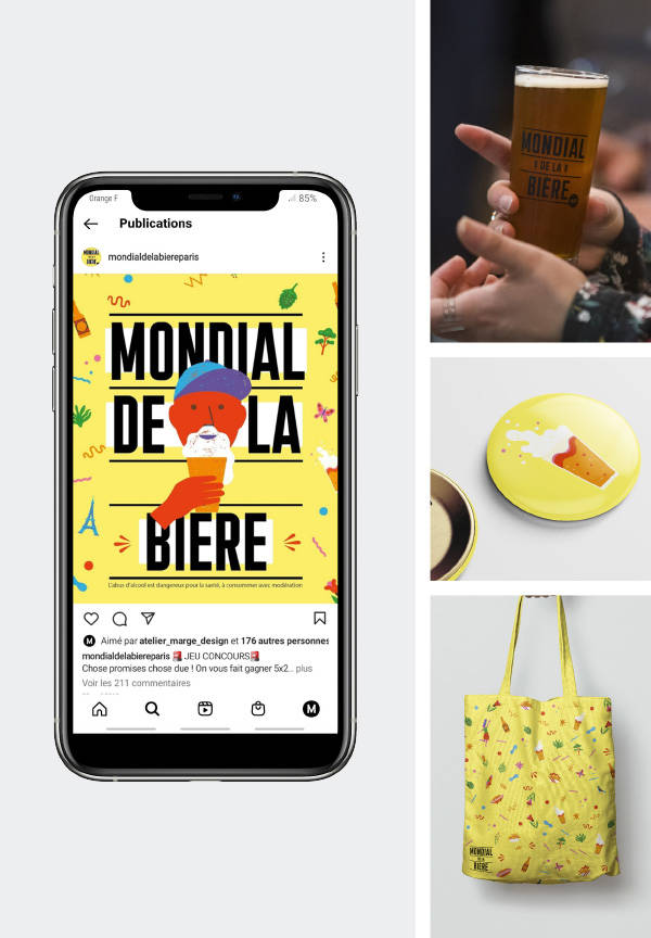 Ce mondial, c’est une belle opportunité de travail, mais aussi une belle occasion de picoler à l’œil. Se revendiquant festival, l’événement encadré par GL Events ne pouvait décemment pas endosser le costume étriqué du salon professionnel. Il fallait du bon gros fun, du rock’n roll et de la culture hipster. En danger immédiat de cacophonie visuelle par l’installation d’un essaim de petits producteurs venus du monde entier avec leurs designs bigarrés, la première et la dernière décision a été de dire : on prend du jaune et on en met partout, on prend une typo et on commence pas à se perdre dans cinquante mille variations, et on appelle un illustrateur différent chaque année pour lui demander de tout faire mousser. Le résultat est plutôt satisfaisant, mais ça n’a pas duré : aucun vase communicant entre les fûts qui se vident et la caisse qui se remplit. Dommage.